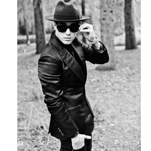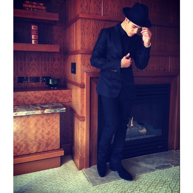 Bieber ma na sobie czarną marynarkę oraz spodnie, a także ciemne okulary i kapelusz. Pod ujęciami w elegantszej stylizacji gwiazdor napisał: Nowy etap i nowy kapelusz.