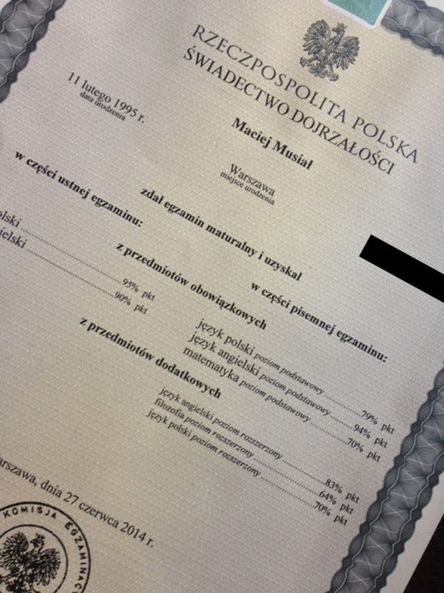 Maciej Musiał postanowił zakończyć spekulacja na temat jego wyników z matury. Dodał na Facebooka zdjęcie świadectwa dojrzałości.. Musiał zdawał język polski, język angielski, matematykę i filozofię. Poszło mu bardzo dobrze.